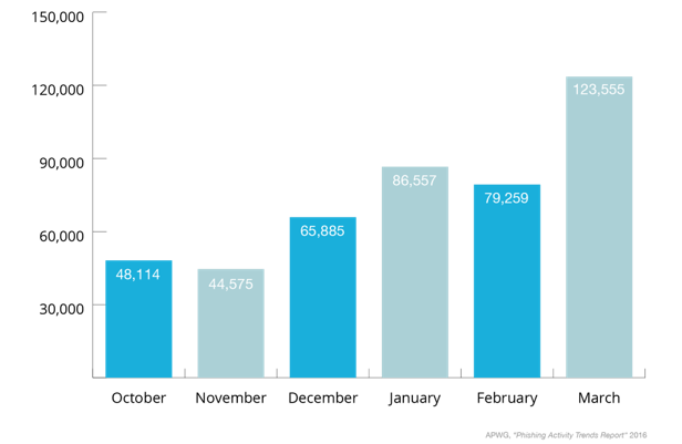 With phishing attacks steadily on the rise, businesses have to be especially careful when clicking links or opening email messages from untrusted sources. The chart below shows the number of unique phishing websites detected monthly, from the last quarter of 2015 through the first quarter of 2016.